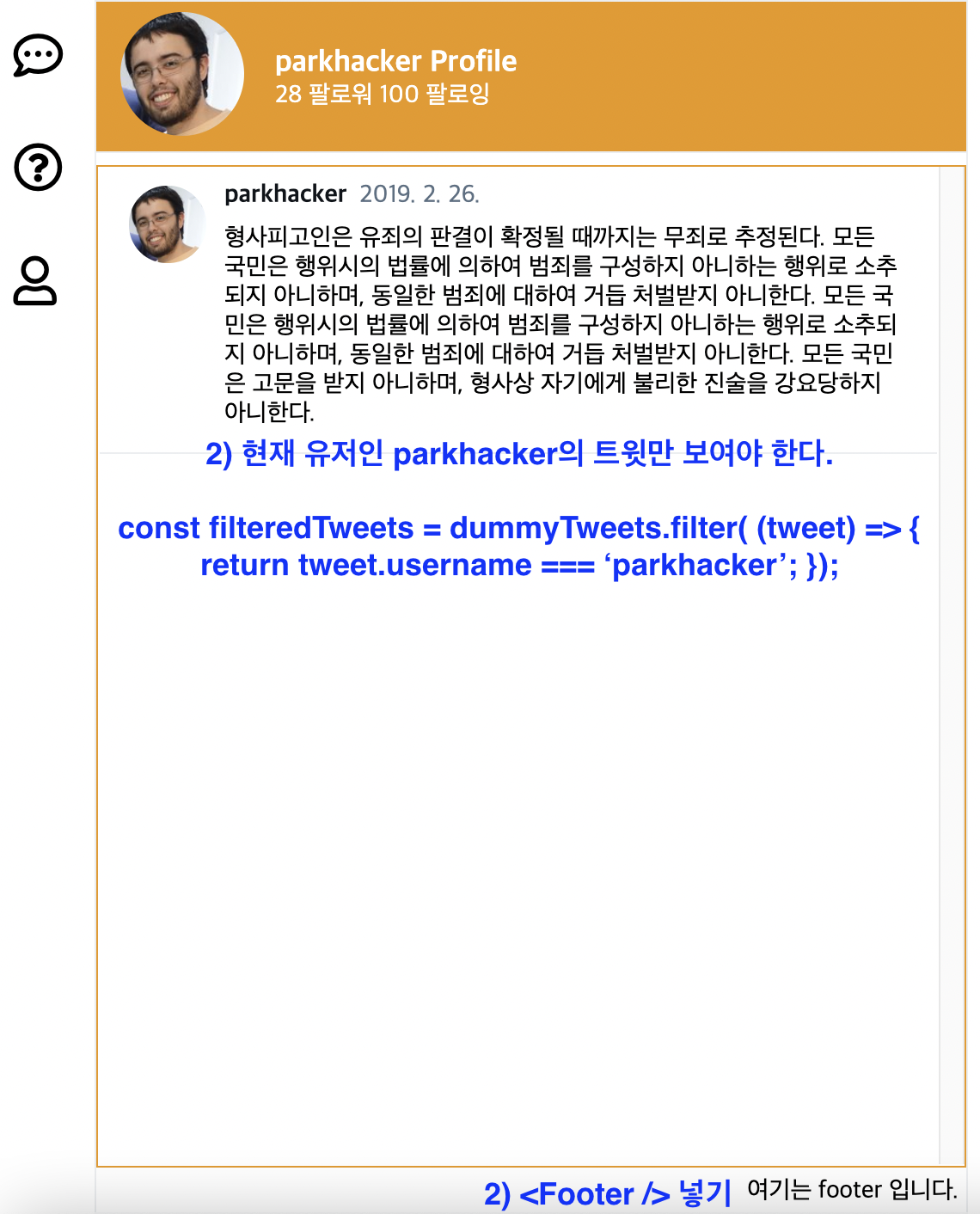 2) MyPage 컴포넌트에 현재 유저인 parkhacker의 트윗만 보여야 한다. Footer 컴포넌트 넣기. MyPage 컴포넌트의 자식인 Tweet 컴포넌트에 props로 각 트윗의 정보(dummyTweets의 요소)가 전달되야 한다.