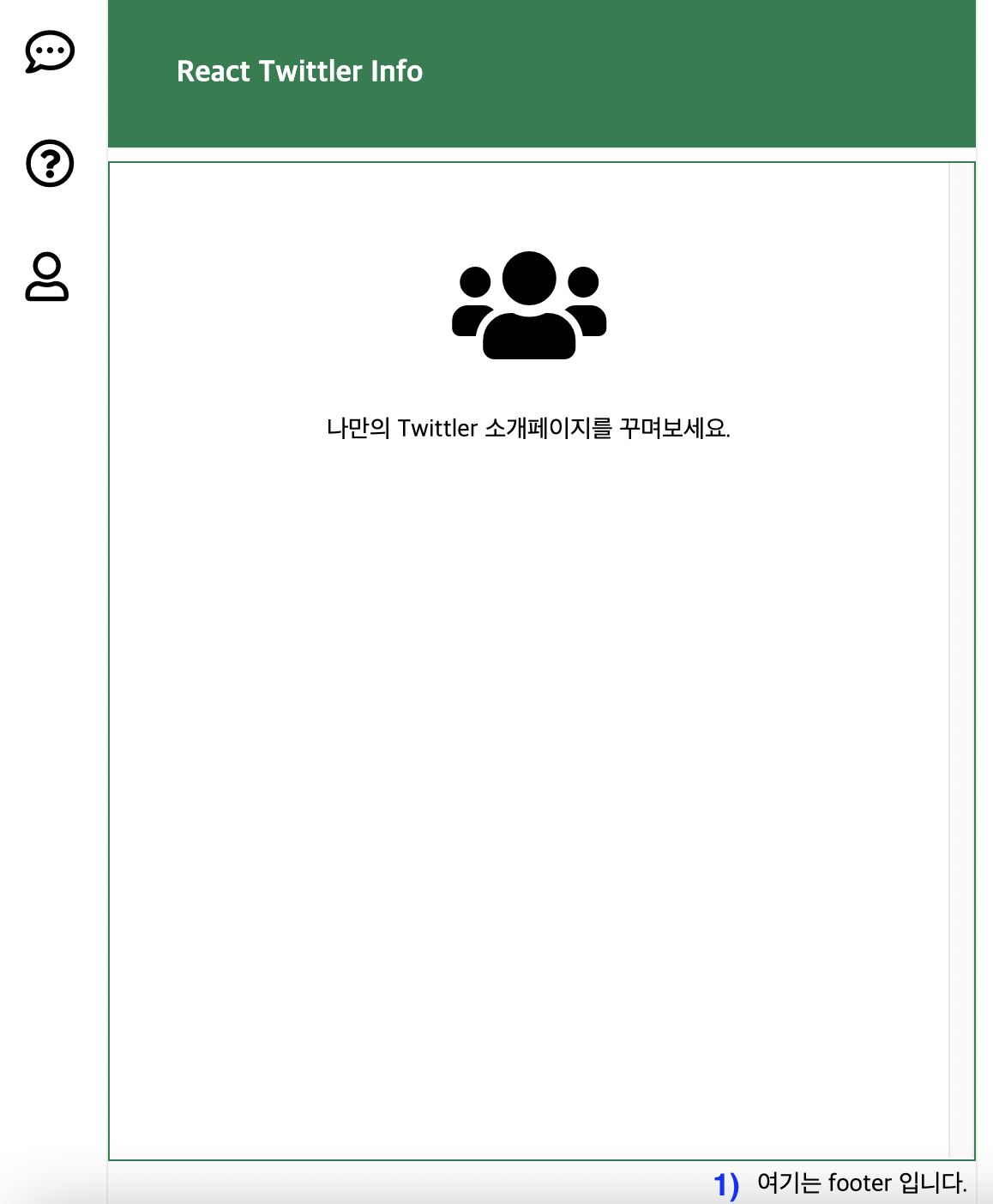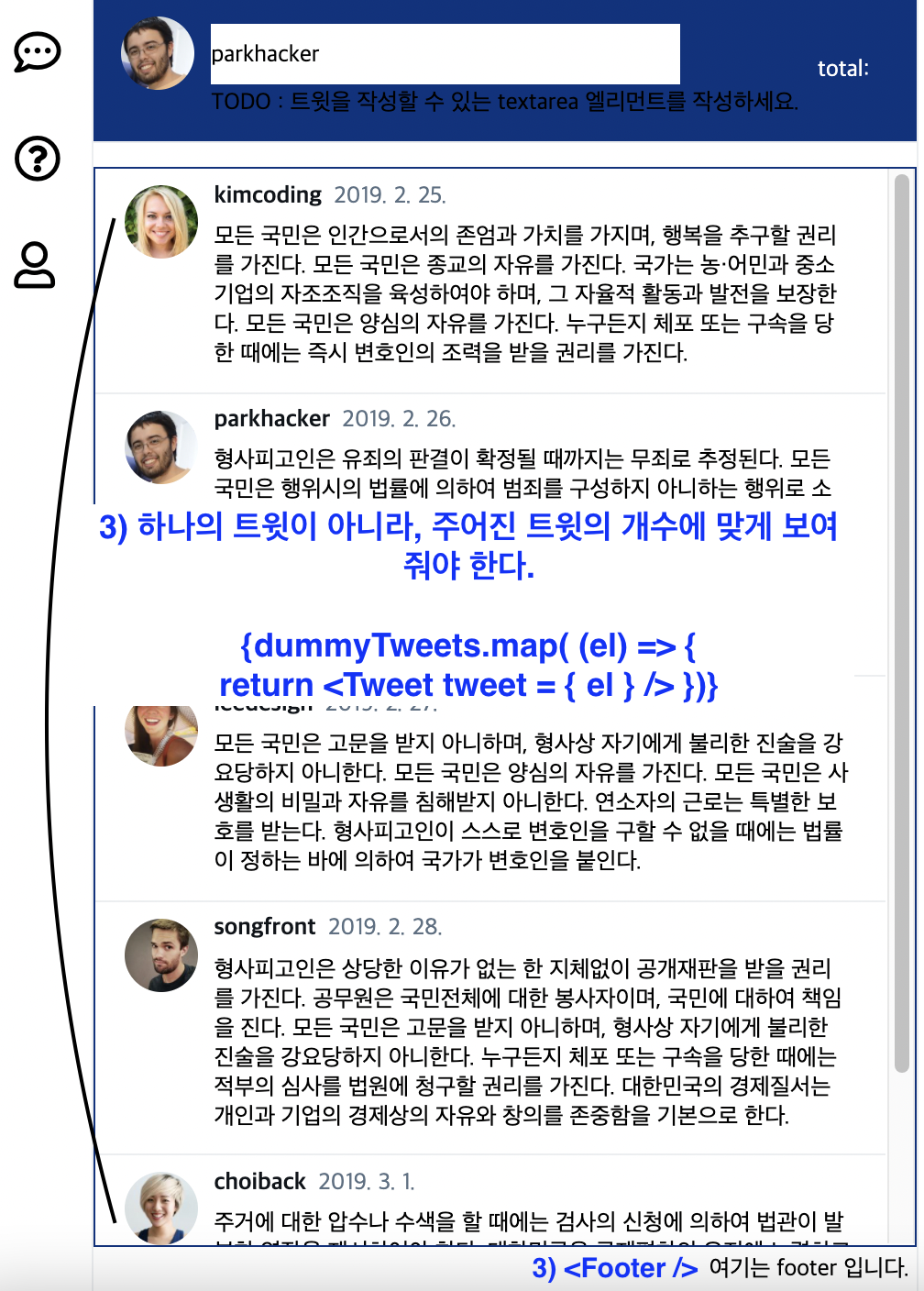 3) Tweets 컴포넌트는 하나의 트윗이 아니라, 주어진 트윗(dummyTweets)의 개수에 맞게 보여줘야 한다. Footer 컴포넌트 넣기.