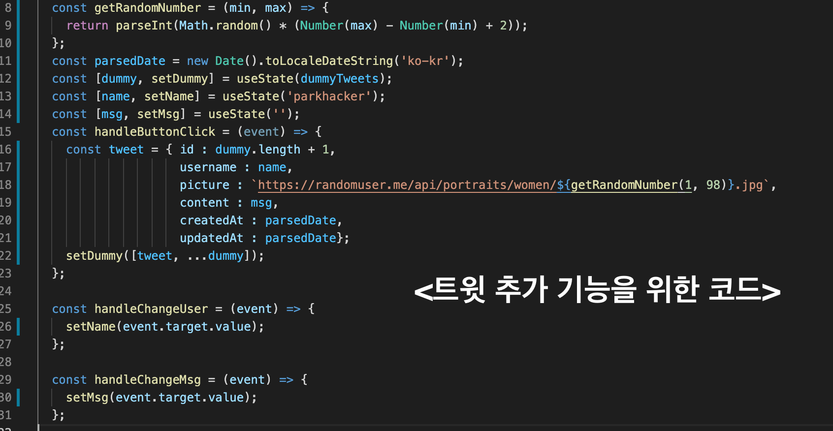 2) Tweet 컴포넌트에 정보 넣기. 이미지, 유저 이름, 트윗 생성 일자, 메세지를 전달받은 props의 정보를 넣어야 한다.