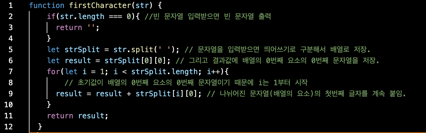 문제 : 문자열을 입력받아 문자열을 구성하는 각 단어의 첫 글자로 이루어진 문자열(string 타입)을 리턴해야 합니다.